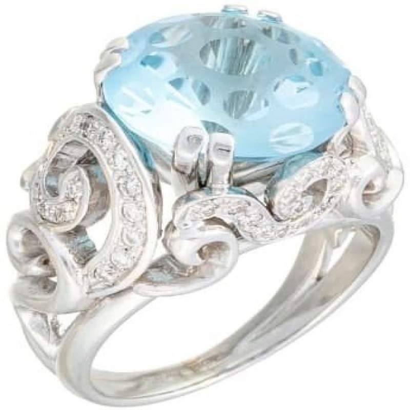 Anello da donna grande ma delicato "Zavitki", realizzato in oro 585 con topazio blu in una esclusiva lavorazione a Punti* o Fungo* e diamanti. I riccioli si trovano su tutto l'anello, tranne che nella parte inferiore della fascia. In alcuni brillano sentieri di pietre, conferendo un ulteriore splendore al gioiello. L'anello nella parte superiore ha una larghezza di 13 mm e i riccioli sostengono il Fungo, che ha un diametro di 12 mm. L'altezza dal dito è di quasi 10 mm. La larghezza dell'anello nel punto più stretto è di 2,5 mm. Incastonatura di pietre semipreziose e preziose naturali di topazio e diamanti (Diamanti ALROSA, Yakutia): 58 brl Kr-57 0,440Ct 3/5 ,1 tpz KabBrl 6,480Ct, peso 10,25 gr.