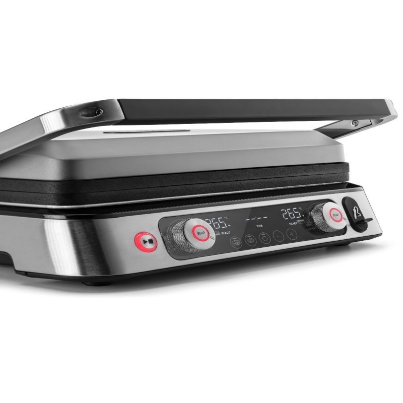 Griglia elettrica multifunzione DeLonghi CGH1112DP. Acquistando la griglia multifunzione CGH1112DP ottieni piatti perfettamente cotti grazie al controllo elettronico della temperatura con termostato indipendente per ogni piastra. Ogni piastra è dotata di un elemento riscaldante integrato, che garantisce una distribuzione uniforme del calore e un rapido riscaldamento della superficie. La griglia multifunzione è dotata di un termostato elettronico che reagisce immediatamente alla caduta della temperatura. Un sensore integrato misura la temperatura esatta del tuo cibo e visualizza le informazioni su un display a LED, permettendoti di controllare la sua temperatura interna e cucinare come preferisci! La funzione SEAR consente al piatto di essere perfettamente rosolato all'esterno, rimanendo tenero e succoso all'interno. Ideale per sigillare la carne nelle fasi iniziali della cottura. La temperatura della piastra raggiunge i 265°C. Riduci descrizione